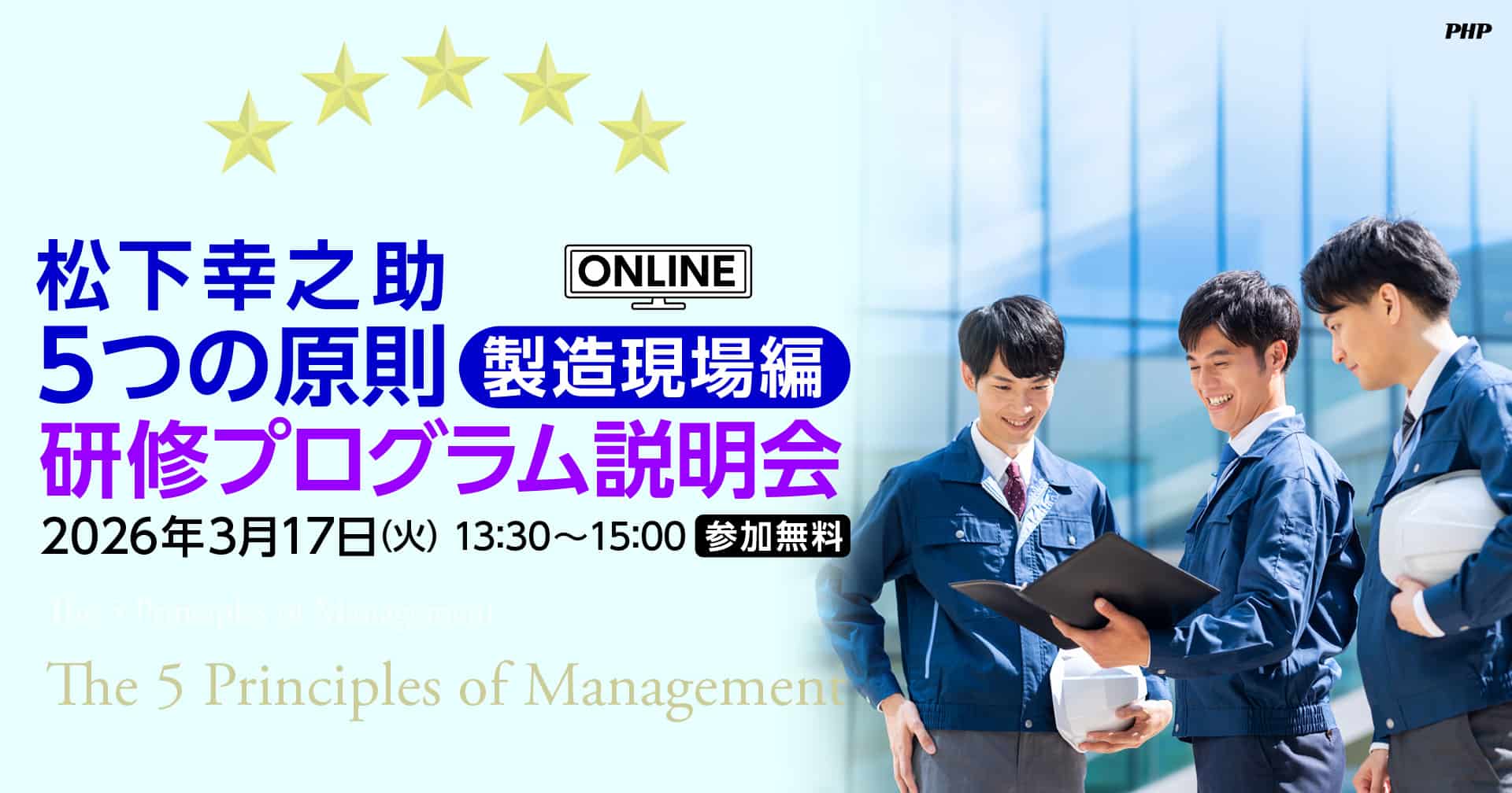 「強い製造現場をつくるリーダー」を育成する風土改善プログラム「松下幸之助5つの原則[製造現場編]」のオンライン説明会を開催いたします。リーダーの意識や行動を変容し、その強い「想い」を組織へ伝播し、皆がやる気をもってイキイキと働く現場をつくる秘訣を、研修講師が解説します。製造業の人事の皆様、ご参加をお待ちしています。
