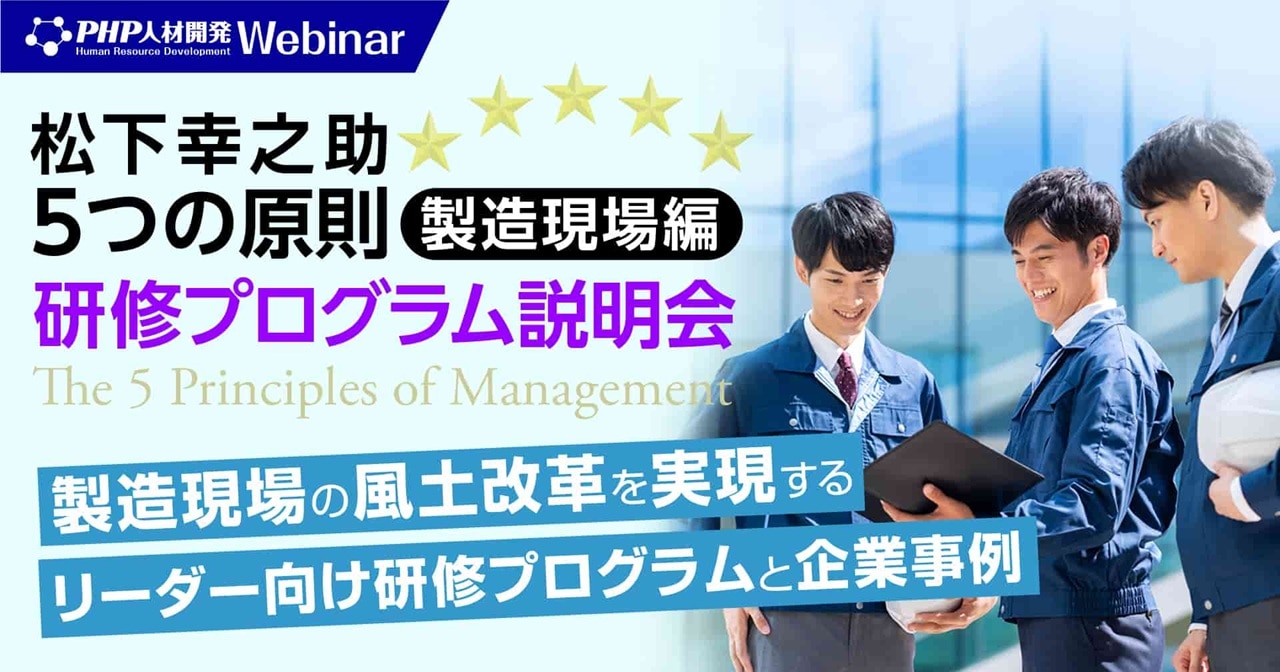 強い製造現場では、メンバー全員がやる気と主体性をもって活動し、各自の個性と能力が存分に発揮され、それがある方向に向かって結集されて前進し続けています。その鍵は、現場リーダーの考え方にあります。リーダーが意識や行動を変えて、現場によい影響を与え続けるにはどうすればいいのか? 「松下幸之助5つの原則」をフレームワークとして、製造現場で働くリーダーのために特別に開発した研修プログラムと、企業での導入事例をご紹介します。